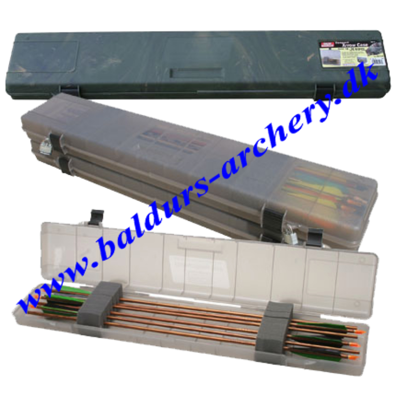 Der er plads til 18, op til 24 pile Compact Arrow Case Designed to fit into a soft bow case pocket, the Compact Arrow Case holds 18 to 24 full length arrows with broadheads, (which are held in place by foam). The case is held shut with MTM's snap-lock latch system. Hinges are made of stainless steel. Two padlock tabs are provided for security. Made with luggage grade, polypropylene for longevity. Stock # Dimensions BH-18S- 36¼" x 7½" x 3" For arrows up to 35.75" total length Color(s): Clear Smoke (41)