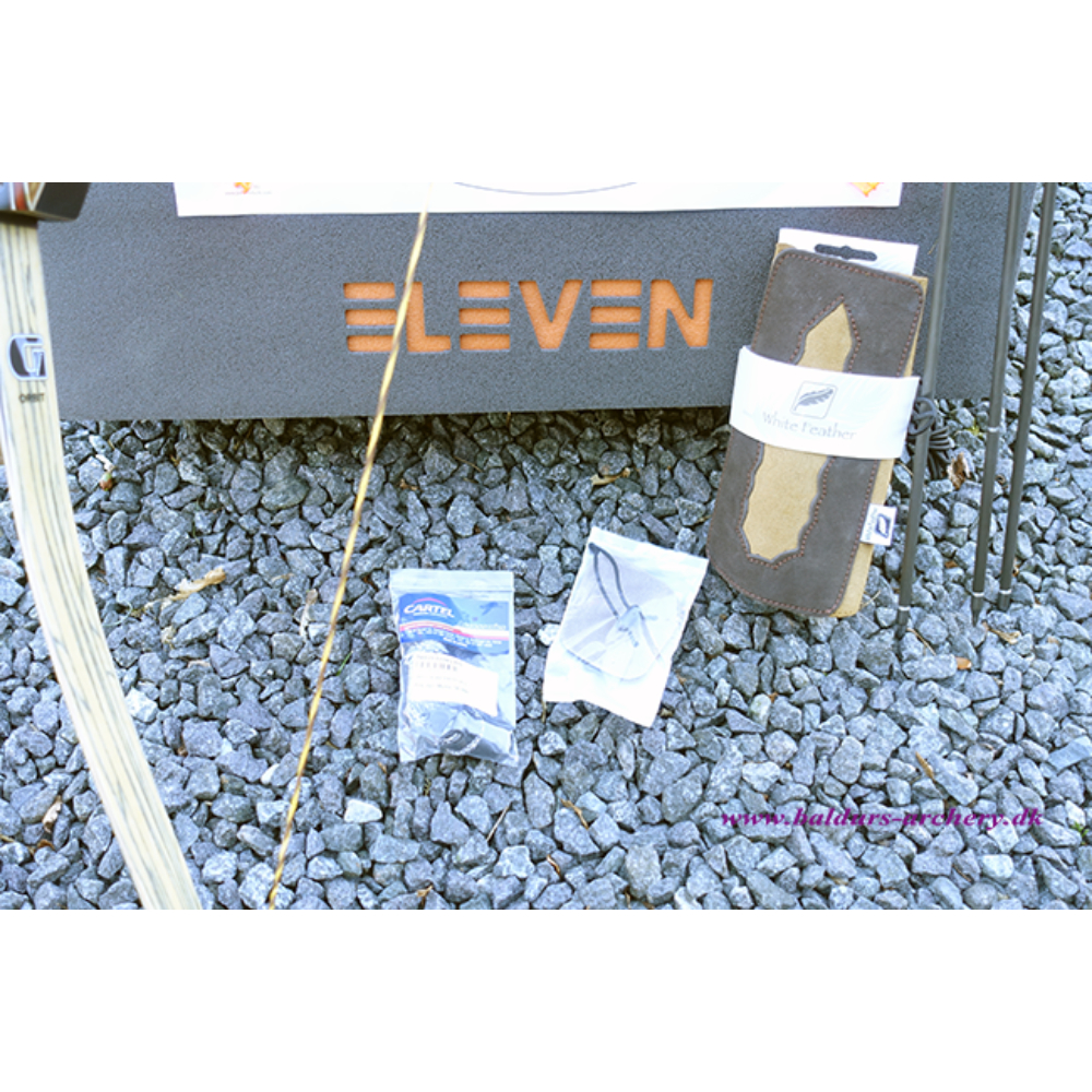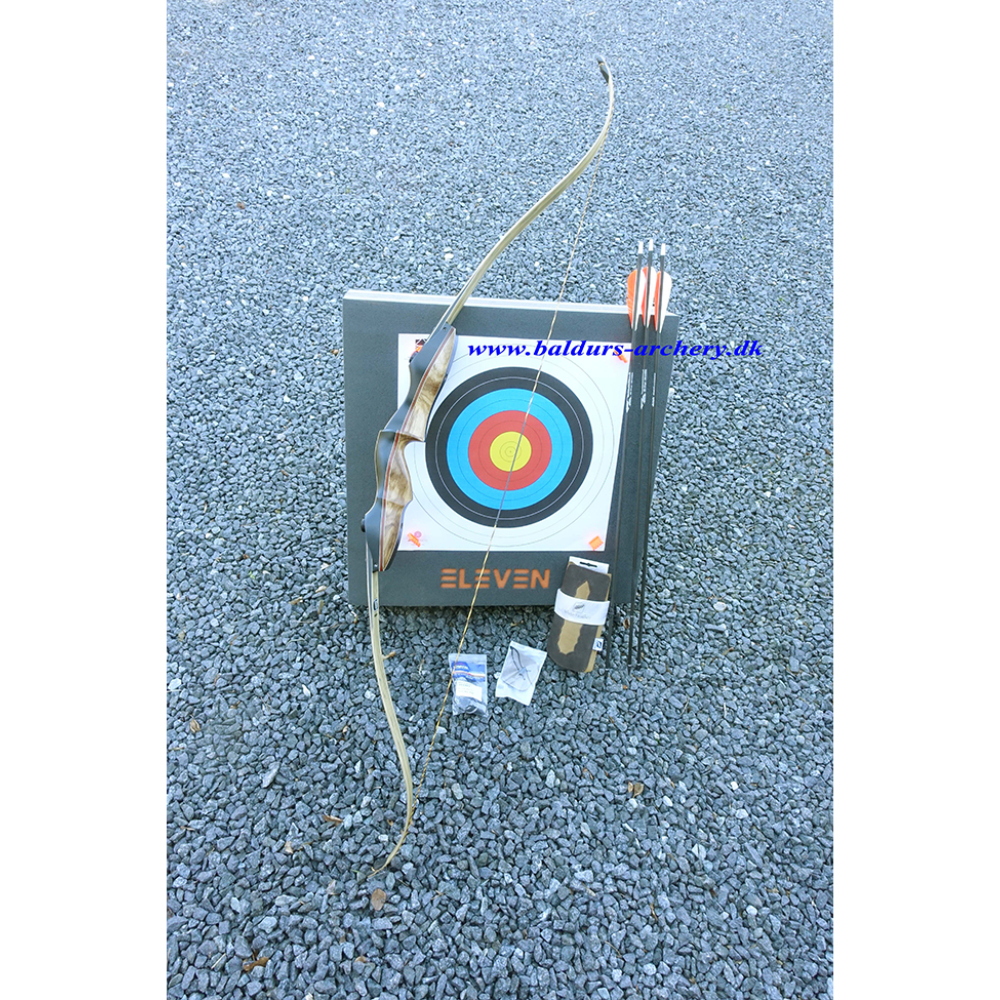 Sættet kommer med: 1 stk. Old Mountain Handle, 1 stk. Gravity Orbit laminat Glasfiber/træ bueben, 1 stk. Bear hair rest, 1 stk. Cartel bowstringer, 1 stk. White Feather eller lign armguard, 1 stk. EXE Traditionel finger tab, 3 stk. Goldtip Arrow samt 1 Eleven Øko Target 14x60x60 inkl. skive og søm.